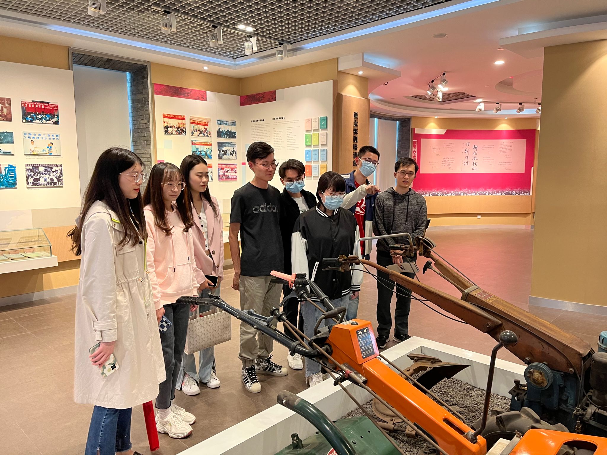随后,同学们随解说员移步至中国农机文化展示馆,了解农机的发展历史。展馆内提供了有关农具的图文讲解,同学们也因此了解了原始农业生产的基础和起点。展厅陈列了学校在农机领域取得的丰硕成果,同学们无不为之感到骄傲和自豪,同时深刻地领会到发展现代农机装备的重要性。