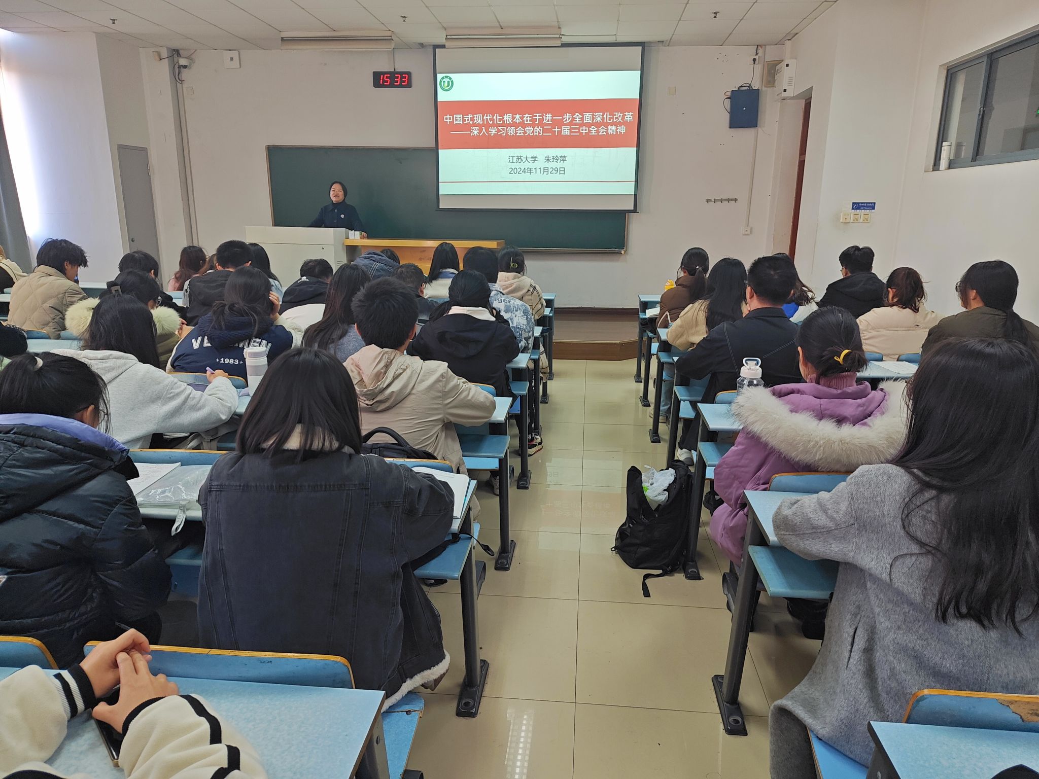 朱玲萍以“大家希望过上什么样的生活”这一互动话题引入,引领大家从党和国家在关键时期进一步全面深化改革“为什么改”、“改什么”以及“怎么改”三个方面进行了系统解读和深入学习。她鼓励在场同学要着重提升创新思维与能力,坚持夯实专业知识与能力,不断增长才干与见识,要以“功成不必在我,功成必定有我”的担当精神,树立爱党爱国的鲜明旗帜,以实际行动为推进中国式现代化贡献青春力量。