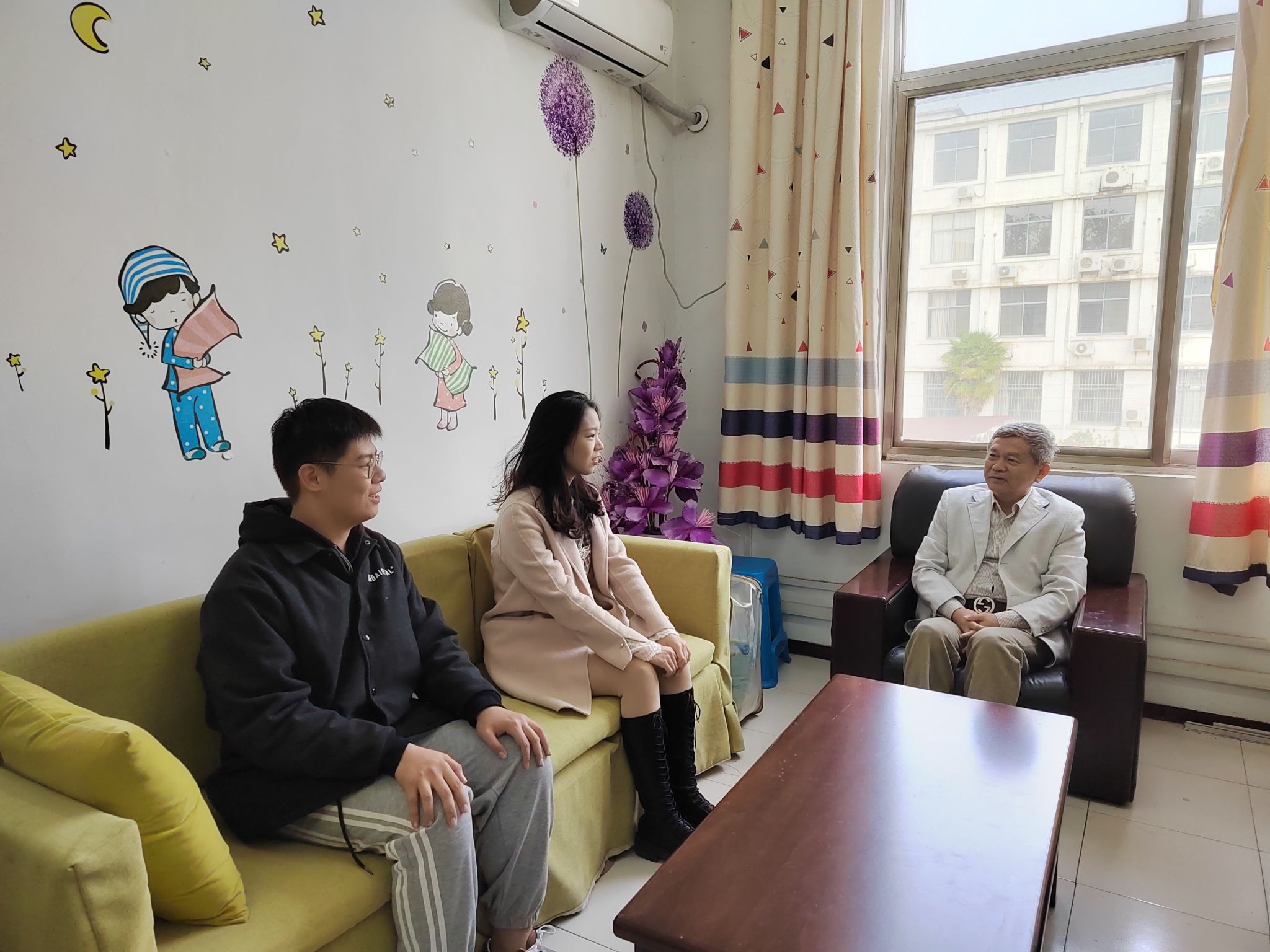 关工委重视“三全育人”工作,认真落实老教师结对指导学生班级,11月4日上午学院关工委老教师与数学与应用数学(中外合作办学)1901班(以下简称:应数国际1901)的两位学生代表胡俊朗、高珊珊,在学院关爱谈心屋进行亲切的交谈。