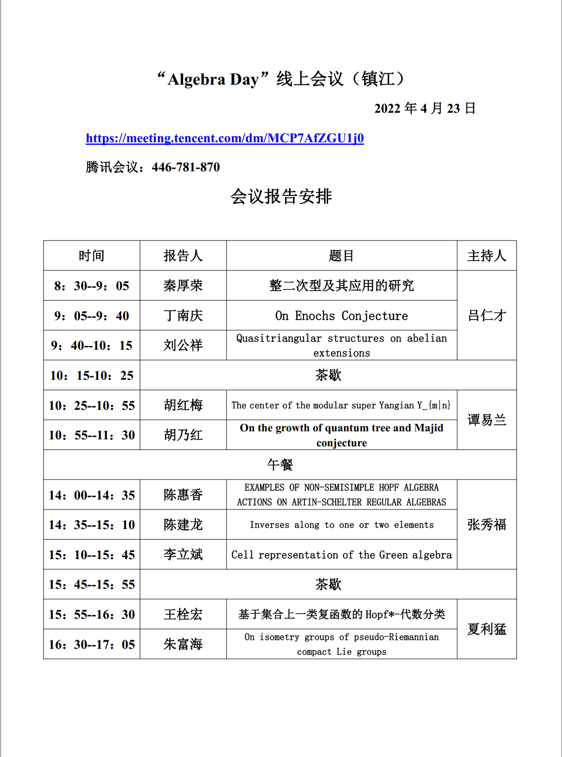 Workshop of “Algebra Day”